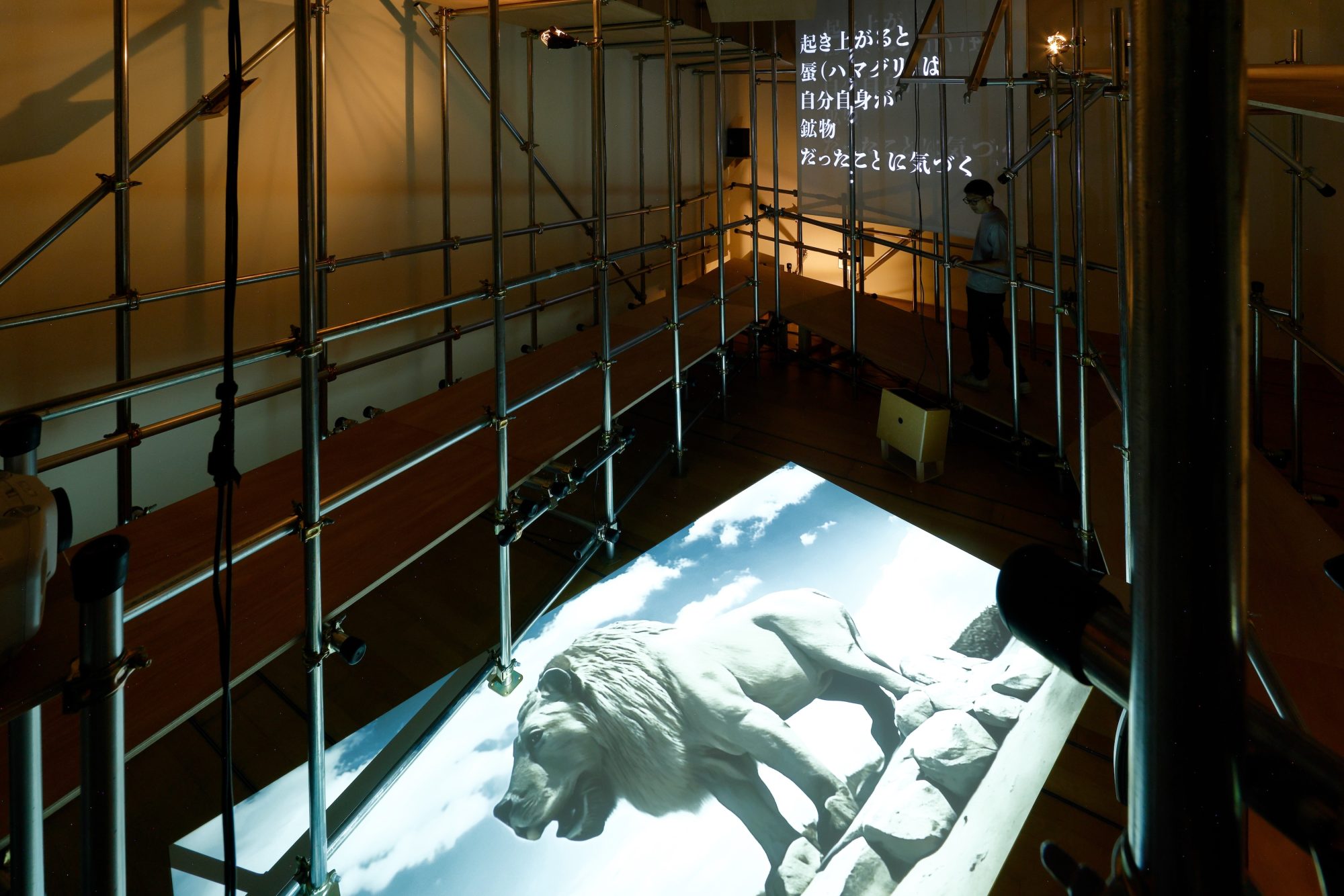 The structure created within the exhibition space suggests a spiral extension of time, connecting the past and future. There, AOYAGI’s imagery and poetry, along with HOSOI’s soundscapes, create a space that compels contemplation of a new, abstract world that exists nowhere yet evokes a sense of utopia or dystopia. This is achieved through their asynchronous relationship, allowing each artist’s imagination to resonate against the motif of artificial land.