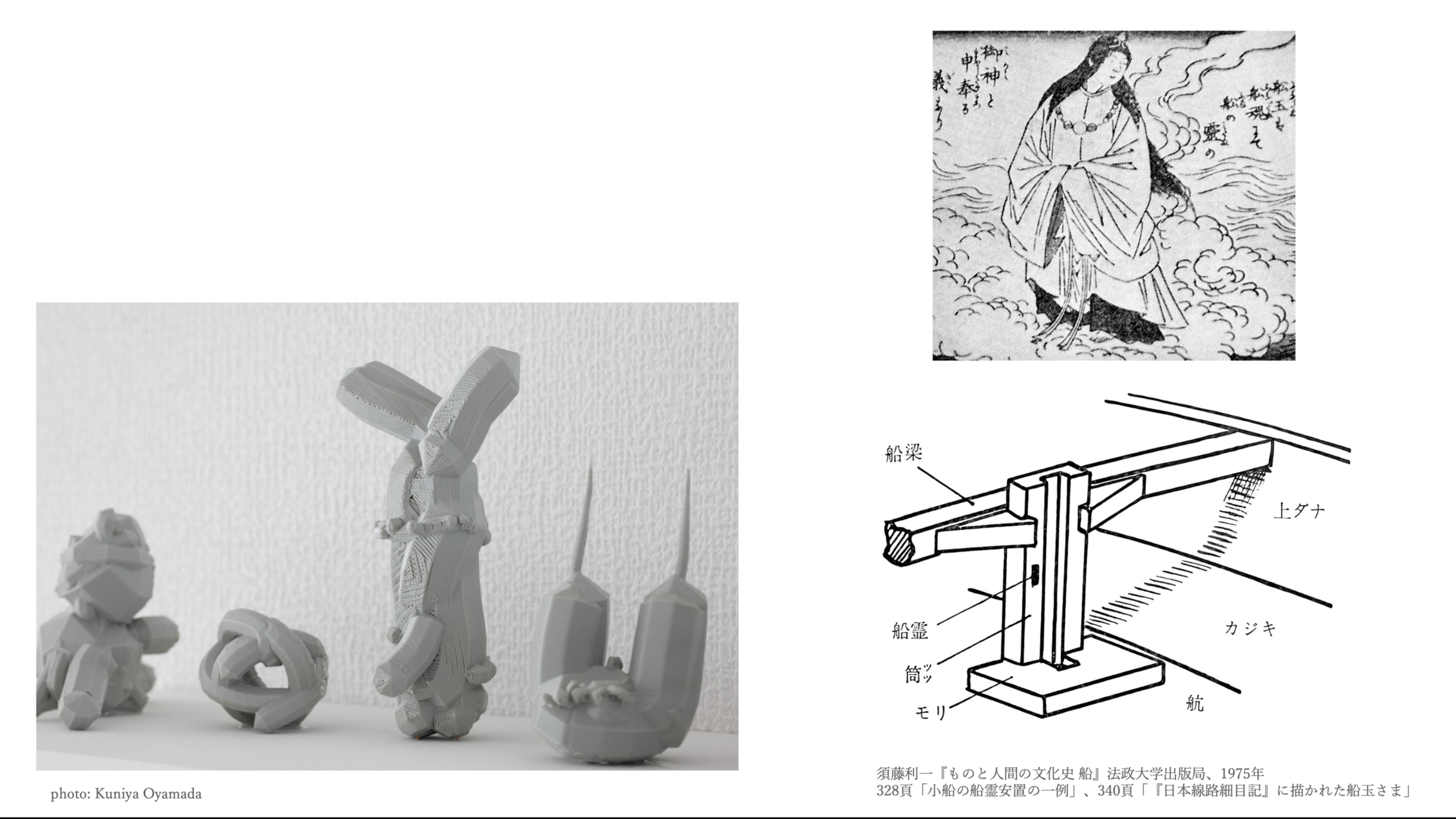 《亡船記》は、2022年に十和田市現代美術館周辺で発表された、都市空間を回遊しながら鑑賞する作品です。中国発祥の航海の女神・媽祖を起点に、海を越えて伝播する信仰や船が時を経ることで変容していくすがたを手がかりに、複数の地点に映像や物語が散在する構成で展開されました。再現の難しい本作を、本発表ではレクチャーパフォーマンスとして再構成します。資料や映像、語りを往還しながら、世界各地に静かに佇む媽祖や航海の歴史、船の名称や物語を辿り、分散していた断片を一つの時間に束ね直します。船とともに移動する人間や動物、貨物、記憶と言語が重なり合い、海を越えて連なっていく想像上の航海を、現在の場に呼び戻す試みです。海は領地や国家、思想を隔てるのではなく、水際として繋ぎ続けているのではないかということを、「在らざる船」というキーワードをもとに語ります。